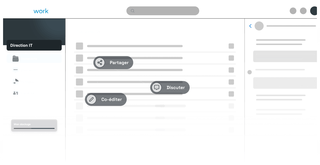 Discutez en temps réel avec vos collaborateurs, mentionnez-les et partagez des liens depuis une messagerie privée ou celle associée aux espaces collaboratifs.