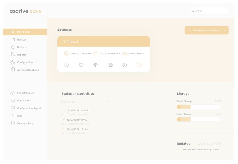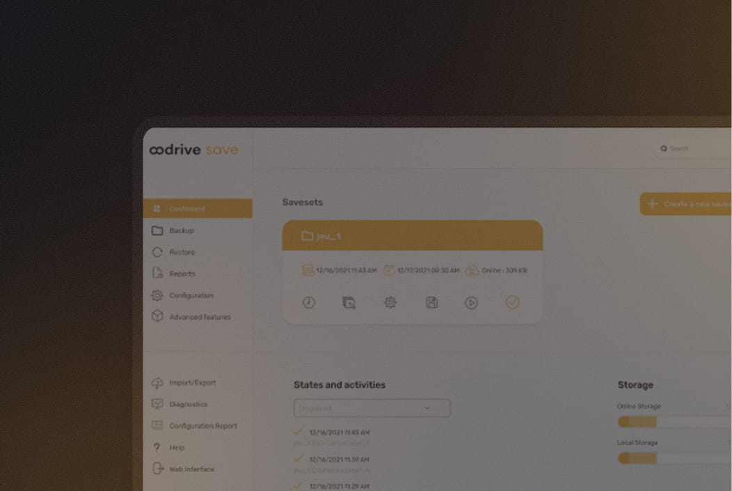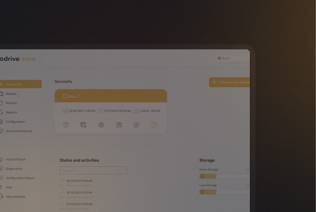 A backup is a secure data archiving system designed for data recovery. The Oodrive Save solution allows you to copy data to your cloud at a specific point in time and restore it in case of loss to get back up and running quickly.